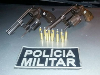 Com eles, foram apreendidos 02 revólveres calibre 38, 12 munições intactas, 1 espingarda socadeira, 2 gaiolas, 1 pássaro silvestre e uma pequena quantidade de maconha.