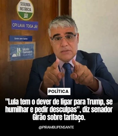 O senador bolsonarista do Ceará, Eduardo Girão (Novo-CE), Estado mais prejudicado pelo tarifaço de Donald Trump, afirmou, em vídeo enviado ao Jornal da Record, que o presidente Luiz Inácio Lula da Silva (PT) deveria telefonar imediatamente para o presidente norte-americano e pedir desculpas.