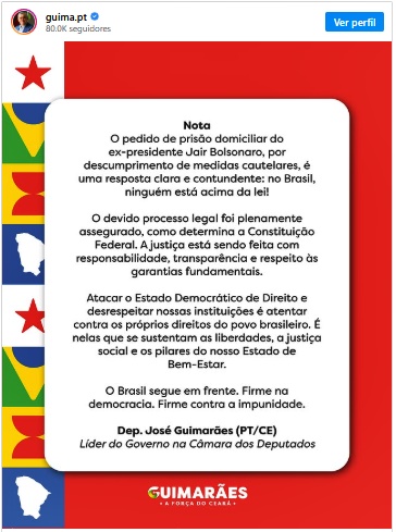 Sobre a “prisão domiciliar de Bolsonaro”, o Deputado José Guimarães(PT) que segue se recuperando de uma cirurgia, escreve em suas redes sociais sobre o caso.