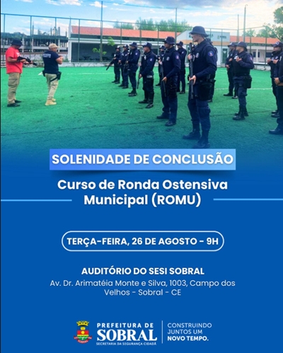 A Prefeitura de Sobral, por meio da Secretaria da Segurança Cidadã, realizará nesta terça-feira (26/08), às 9h, a Solenidade de Conclusão do Curso de Ronda Ostensiva Municipal (ROMU), no auditório do SESI.