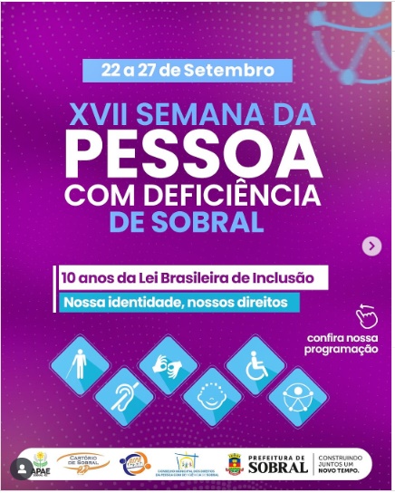 Artes em fundo roxo anunciam a XVII Semana da Pessoa com Deficiência de Sobral, de 22 a 27 de setembro de 2025, com o tema: “10 anos da Lei Brasileira de Inclusão: Nossa identidade, nossos direitos”.