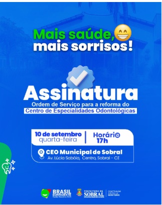 A Prefeitura de Sobral dará mais um passo importante na valorização da saúde bucal com a assinatura da Ordem de Serviço para a reforma do Centro de Especialidades Odontológicas (CEO) Sanitarista Sérgio Arouca. O ato será realizado nesta quarta-feira (10/09), às 17h, e marca o início da reestruturação do primeiro CEO inaugurado no Brasil.