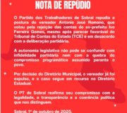 O Diretório Municipal do Partido dos Trabalhadores em Sobral divulgou, nesta quarta-feira (1º/10), uma nota de repúdio contra a postura do vereador Antonio José Romano, eleito pelo PT e integrante da Federação Brasil da Esperança. O parlamentar contrariou a deliberação partidária e votou, no último dia 30 de setembro de 2025, pela rejeição das contas de governo do ex-prefeito Ivo Ferreira Gomes (PSB), mesmo após o Tribunal de Contas do Estado (TCE-CE) ter emitido parecer […]