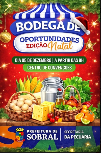 A Prefeitura de Sobral, por meio da Secretaria da Pecuária, realiza na próxima sexta-feira, dia 5, mais uma edição do Bodega de Oportunidades, desta vez em clima especial com a Edição de Natal. O evento acontecerá no Centro de Convenções, a partir das 8h, em um espaço amplo, climatizado e preparado para receber produtores rurais, artesãos e o público em geral.A iniciativa já se consolidou como um dos principais instrumentos de fortalecimento da economia local, oferecendo um ambiente seguro e organizado para a comercialização de produtos da agricultura familiar.Com a proposta de aproximar quem produz de quem consome, o Bodega de Oportunidades abre espaço para que agricultores, cooperativas e associações ampliem sua renda e promovam o desenvolvimento sustentável no município.