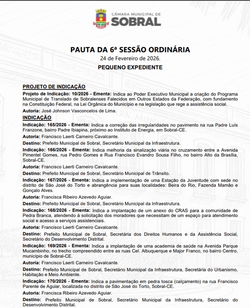 A Câmara Municipal de Sobral realiza nesta terça feira(24) a sua 6ª Sessão Ordinária deste ano de 2026, sob o comando do presidente Chico Júnior(UB) e secretariada pelo Vereador Johnson Lima(UB).