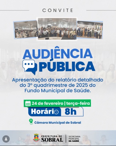 A Secretaria da Saúde de Sobral realiza nesta terça-feira (24/02), a audiência pública de prestação de contas referente ao terceiro quadrimestre de 2025 do Fundo Municipal de Saúde. O encontro começou ás 8h, na Câmara Municipal de Sobral.