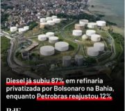 BRASIL – SAFADEZA!! Diesel já subiu 87% em refinaria privatizada por Bolsonaro na Bahia, enquanto a Petrobrás reajustou em 12%.
