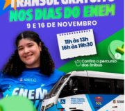 A Prefeitura de Sobral, por meio da Secretaria do Transporte (Setransp), vai garantir o funcionamento e a gratuidade do Transporte Urbano de Sobral (TranSol), para que os inscritos, passam participarem da aplicação das provas do Exame Nacional do Ensino Médio (Enem), que acontecem neste domingos(9), bem como, no dia 16 de novembro, onde ocorrerá a última etapa do ENEM. O serviço gratuito funcionará em dois turnos: das 11h às 13h e das 16h às 19h, […]